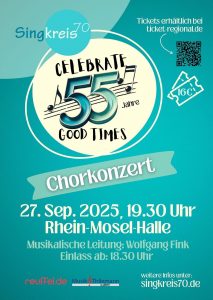 Mit „Celebrate Good Times“ feiern wir unser 55-jähriges Chor-Jubiläum mit einem ganz besonderen Konzert: Wir präsentieren Ihnen populäre Songs aus Rock, Pop, Soul & Folk aus den sechs Jahrzehnten unseres Bestehens -von den 70ern bis heute.